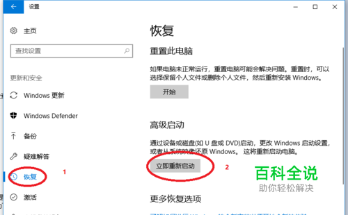 在“更新和安全”界面中点击左侧的“恢复”选项,然后再在右侧的“高级启动”中点击“立即重新启动”