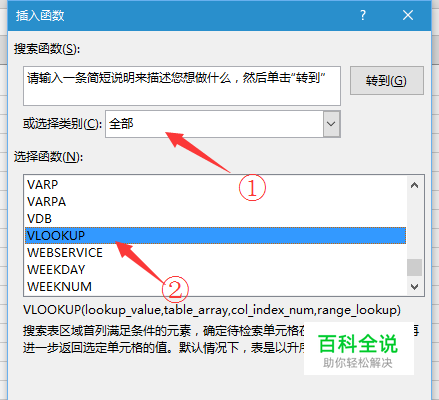 进入插入函数对话框,在选择类别下拉框选择【全部】,选择函数选择框选择【VLookup】,选择完毕后点击【确定】或双击选定的函数。 其他方法请参考本步骤经验引用