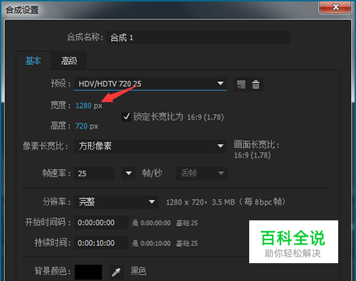 这里先来在软件中新建一个合成。合成的大小自定。这里来新建一下大小为1280*720像素大小的合成,像素长宽比为方形像素。这里持续时间可以先设置为10秒不要太大。把它的默认背景色仍为黑色不做更改。设置完成后点击确定。