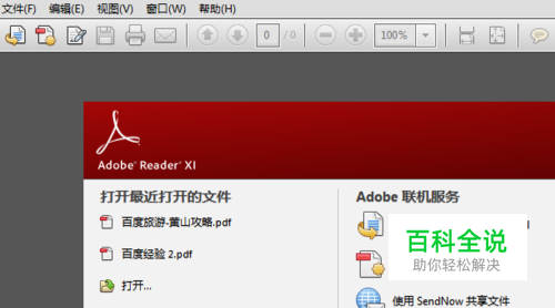 打开Adobe Reader后,会出现一个空白的页面,在这个空白的页面中点击“打开”打开一个pdf格式的文件,如图所示。