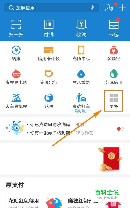 打开支付宝应用,在首页中点击快捷菜单中的【更多】选项。