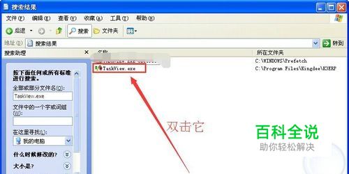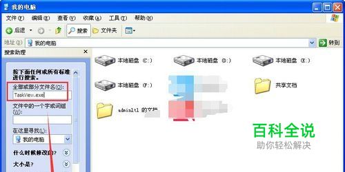 打开“我的电脑”,在“我的电脑”窗口的上方点击“搜索”。 在搜索框“全部或部分文件名:”下面输入“TaskView.exe”,然后点击搜索