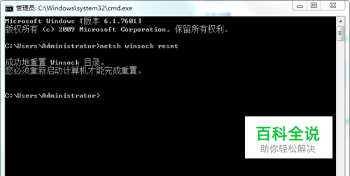在上述对话框中输入"netsh winsock reset",并按回车,此时系统提示充公重置winsock目录,然后重启即可(注意输入的时候中加的空格不要忘记,不然会提示你无效的)