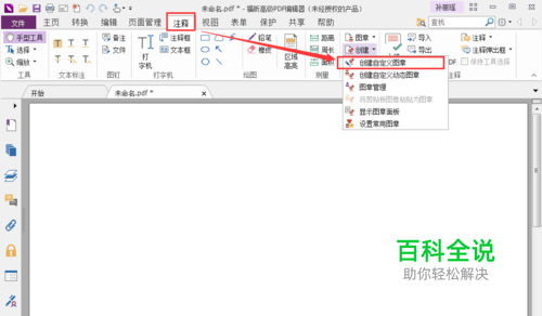 用福昕PDF编辑器(个人版)打开需要添加电子图章文档,点击导航栏的“注释”—>“创建”,选择“创建自定义图章”