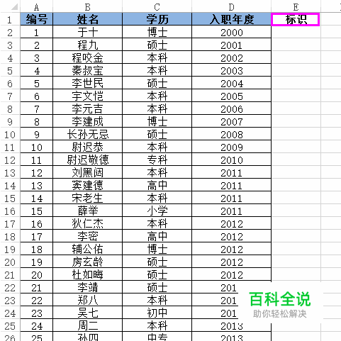 在表格后空白的一列表头位置添加个表头,此处我们添加“标识”一列。