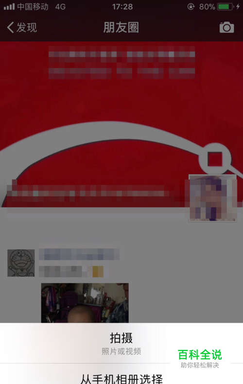 打开微信朋友圈,点击右上角相机图标,选择“拍摄”或者“从手机相册选择”视频或图片: