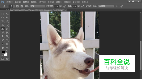 现在看着就差不多了!现在用同样的方式:在脖子上面有毛的地方按住"Alt"点一下鼠标左键,放开左键,然后点有绳子的地方,重复,直到绳子基本看不出来为止,差不多处理到这个效果。