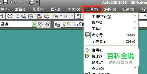 打开cad进入绘图窗口以后,用鼠标点击窗口最上面一行里面的“工具”按钮。点击“工具”会出现下拉菜单