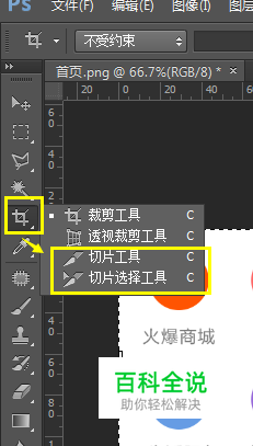 首先找到切图工具,左侧第5个工具剪切下的子工具(切图工具 和切图选择工具 ),鼠标点击就会出现(我们拿这几个图片作为例子)