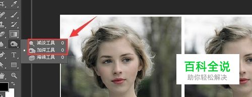 点按工具栏左侧的加深 减淡 海绵工具 长按鼠标会弹出菜单 点选加深工具