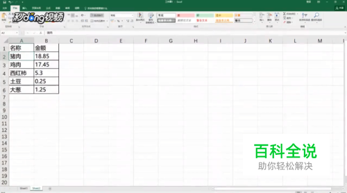 打开Excel,首先建立一个样表,以删除A2单元格中的内容“猪肉”为例。
