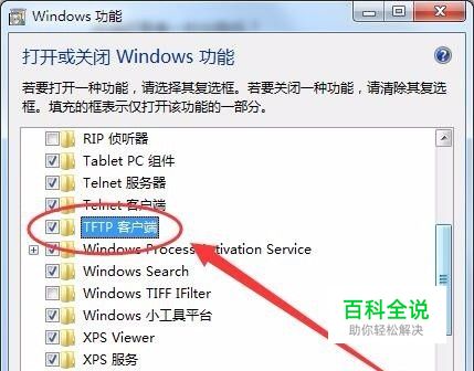 Windows功能窗口中,选择TFTP客户端前的勾。