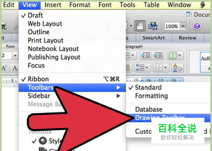 打开绘图工具栏。如果您没看到窗口底部的绘图工具栏,单击查看菜单,将鼠标悬停在工具栏。从工具栏子菜单中选择绘图,绘图工具栏会出现在窗口底部。