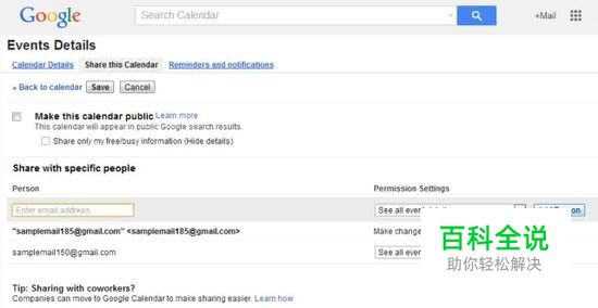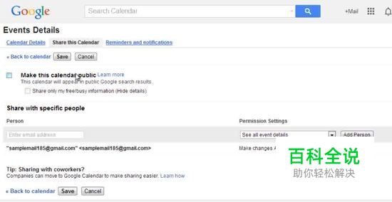 输入收件人的邮箱。在“和特定的人分享”下面,输入每个人的邮件地址或者发送邮件给你想分享的人。你可以决定每个人看你的日历的权限,然后点击“添加人物。” “浏览所有活动的细节”意味着接收者将可以在日历上看到任何活动的地点和说明。 ”进行更改并且管理分享” 意味着接收者可以添加并且编辑活动也可以在日历里添加更多的人。“对活动进行更改” 使使用者拥有权利来编辑日历但是不是谁都可以进入。 ”仅看空闲或忙碌” 隐藏了关于活动的所有细节并且呈现给日历使用者简单的空闲或忙碌。 你可以添加多样的有着不同层级来控制这个方法的人。