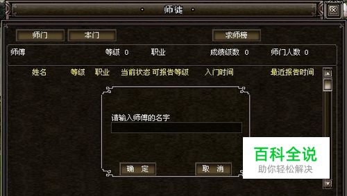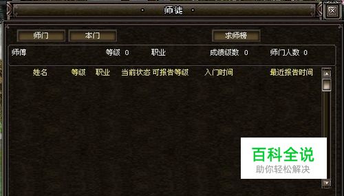 拜师需要做的环节。 要想真正脱离新手的身份,就必须了解更多的知识,通过“求师榜”找个好师傅是最佳途径。 当你达到5级的时候,即可在社群菜单中的师徒界面,点击界面右上方的“求师榜”,弹出求师榜界面。 该界面上显示登记上榜的玩家名称、等级、职业、徒弟数量和登记时间等信息。选择某一个玩家向其发出“拜师申请”,如果对方同意,则双方师徒关系建立,你成功的找到了一个师傅,记得一定要在20级以前拜师哦~20级以后将不能进行拜师了!