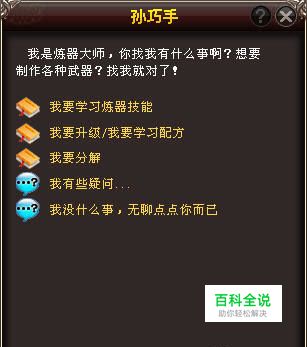 当玩家学会炼器技能后就可以使用装备分解功能了,使用分解功能可以将装备分解成生活技能所需要的材料。 当玩家学会炼器技能后,点击炼器NPC打开炼器技能选项界面。