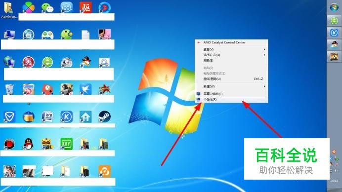 在桌面空白处点击鼠标右键,然后点击[个性化]按钮进去。