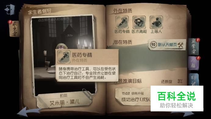 我们先来看一下医生的特质介绍。 特质1:医药专精。 随身携带治疗工具,可以在受伤状态下治疗自己,专业技术让她在使用治疗工具时不会产生消耗。