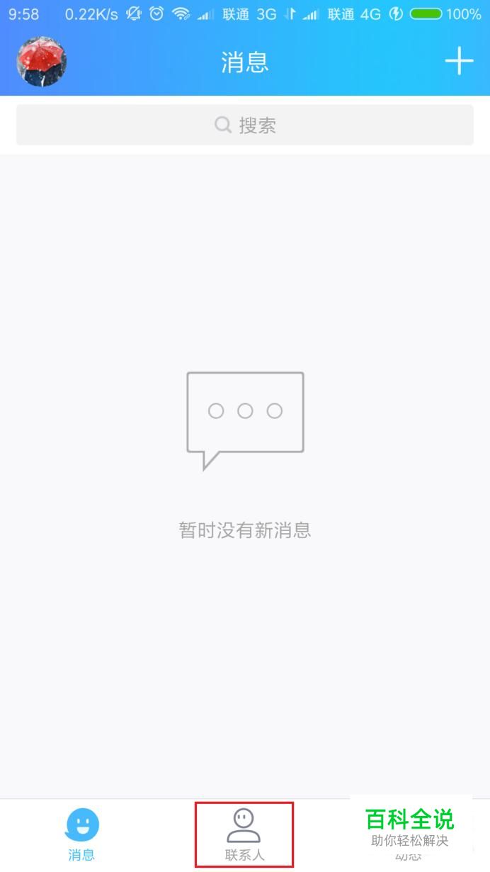 首先,打开手机QQ软件主页面,点击页面底部“联系人”菜单选项。