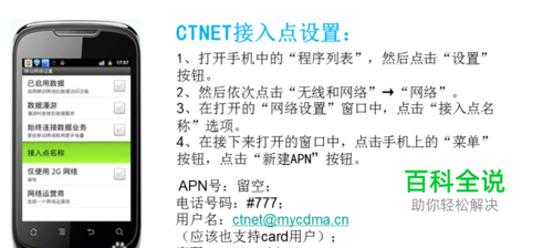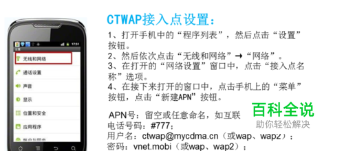 1、CTWAP接入点设置:打开手机中程序列表 设置--无线和网络(或网络设置)--点击接入点名称等等,详情见下图。