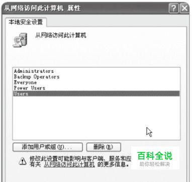 步骤3:双击“从网络访问此计算机”,在弹出的窗口中你可以点击“添加用户或组”来添加可以访问你共享资源的用户,当然你也可以点击“删除”按钮来删除你不信任的用户,这样,你就可以设置只让特定的用户访问你的共享资源了