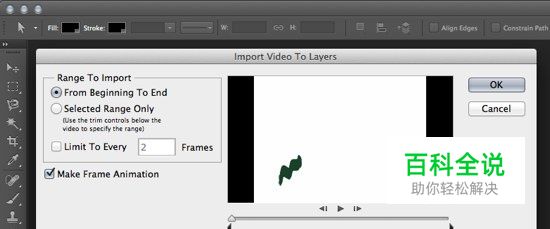 调整导入设定。在弹出的设定窗中调整设定 导入范围: “从开头到结尾”是最简单的导入方式。Photoshop会把所有的帧都导入,如果有超过500帧,则会导入500帧前的内容。 “只导入选定范围”则可以选择开始帧和结束帧间的范围导入,通过下方调节栏调节范围。用滚动指针快速浏览电影片段,把间隔按钮拖入,来设置范围。 限制为每N帧,则会把帧至少切为一半,不过这样的结果是画面不顺畅。 创造帧动画,可以使得影片动画和帧画面之间可以互相转换,取消选择还是会导入一帧一帧的画面,不过不会创建为动画,本指南中我们勾选这个选项。 完成设置后,点击确认导入影片,需要等几秒钟,然后看到图层界面中出现所有的单个帧,所有帧都列在时间轴上。
