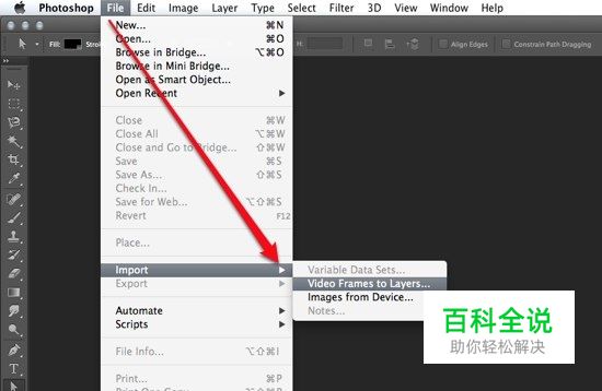 打开视频。在文件菜单下选择导入-视频帧到图层 选择视频文件,注意Photoshop只支持最高500帧的影片,如果你的影片比500帧要长,就先剪裁一下。