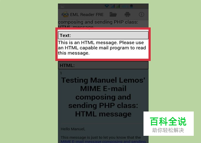 下载免费的EML阅读器(如:“EML Reader FREE”)应用程序。安卓设备本身不支持EML格式的文件。打开EML文件的唯一方法就是在安卓设备上安装相关的应用。 “EML Reader FREE”是安卓设备上可用的高评分EML阅读器之一 ,如果你愿意的话还可以使用其他应用。在谷歌应用商店中搜索“eml阅读器”即可。