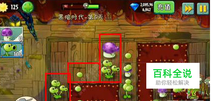 3、我们一定用阳光在左边种豌豆并升级,而且前面的小喷菇升级。这边注意一点:因为升级后的三法豌豆是三排攻击,种在最上面不划算。如果僵尸过多的重叠的话,那就直接用能量豆秒杀(右上角那个横条是非常好的地方) 4、轻松过关,因为小喷菇不用阳光消费,已有CD就可以一直种植,用火力杀死他们!