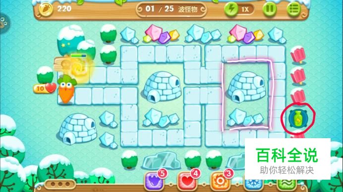 我们继续放一个魔法球在图示红色画圈地方,攻击最后一个白色雪屋,这样三个额外任务就都完成了,继续清除道具和升级炮塔,保证萝卜不受伤害就可以了哦。