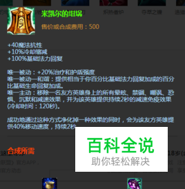 具体使用方法:这件装备是一件典型的辅助性装备,一般由辅助英雄使用,主要功能就是给队友解控制技能,相当于召唤师技能中的净化技能。当有队友被敌方控制技能命中时,可以用它来给队友解除控制效果,同时还可以提供一定的护盾和血量。帮助队友生存下来。