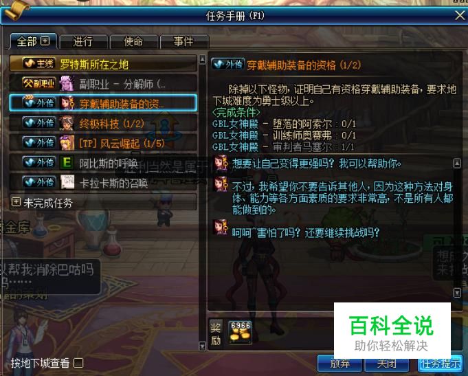 完成“穿戴辅助装备的资格(2/2)”后,可以在任务列表中接取“穿戴辅助装备”外传任务。