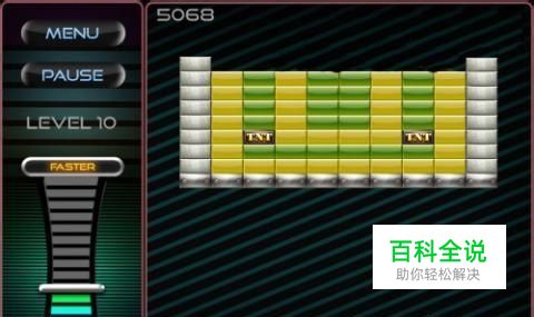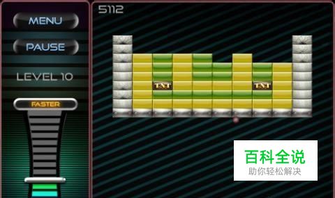 在第十关游戏中,游戏难度明显增加了,既有钢砖,也有泥砖,而且是包围在其他砖块周围,还有厉害的TNT砖。