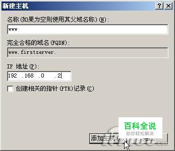 新建主机。在管理界面左框内右击刚才建立的区域名firstserver,选择“新建主机”;在如下图所示“新建主机”窗口的名称栏输入www,IP地址改为本文开头例中的WEB服务器地址 192.168.0.2,单击“添加主机”返回管理界面,即可看到已成功地创建了主机地址记录 “www.firstserver.com”。