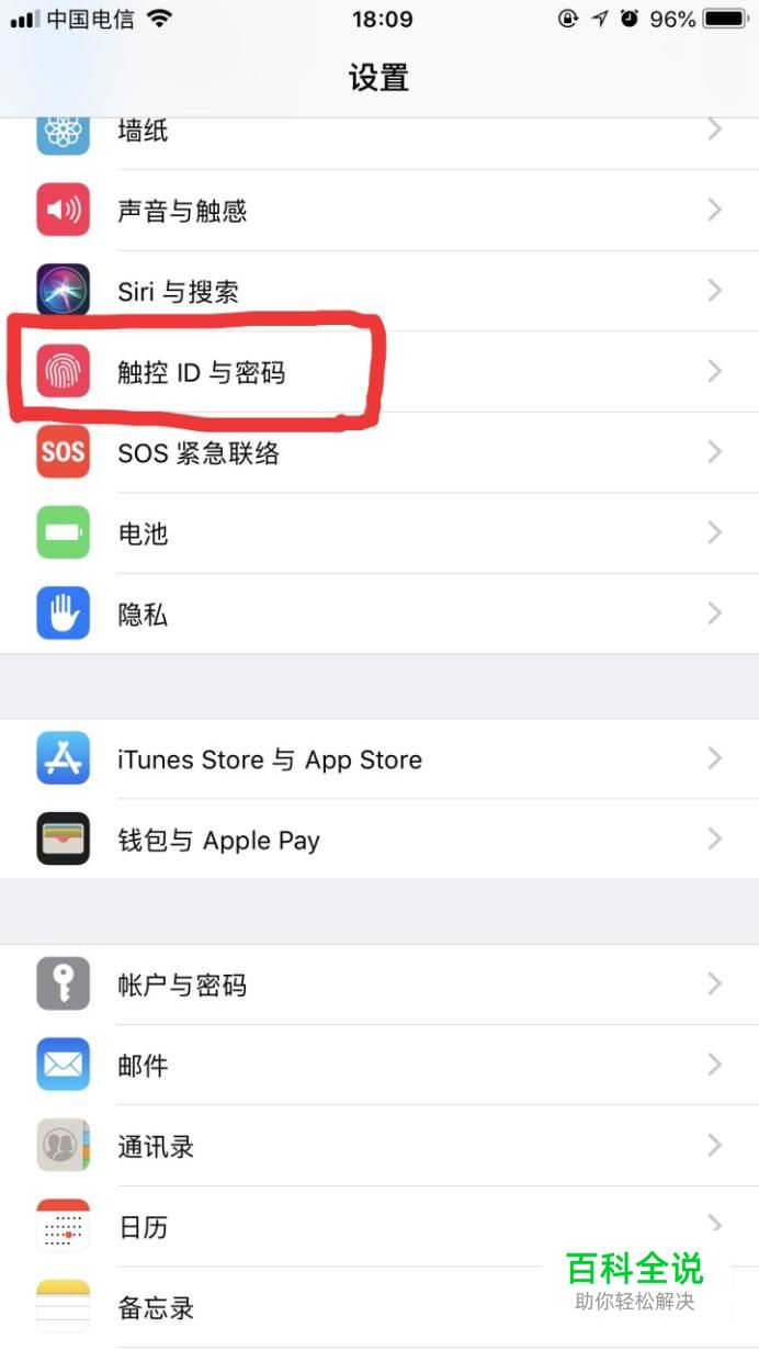 首先进入手机的设置,选择“触控ID与密码”。