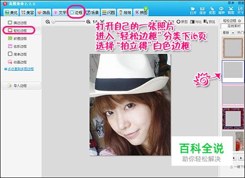 在软件下,打开一张自己的照片,进入“轻松边框”分类下,用鼠标选中在线素材16页中的“拍立得白色边框”。
