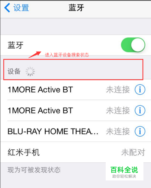 第一步:打开手机设置界面,选择蓝牙耳机右滑打开蓝牙进入搜索设备状态