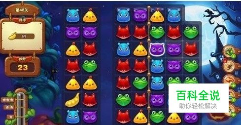开心消消乐第48关,由于各种障碍的存在,这关地图最宽才三列,因此几乎无法主动形成纵向直4发光动物。在自由降落的过程中,有可能形成直4发光动物。