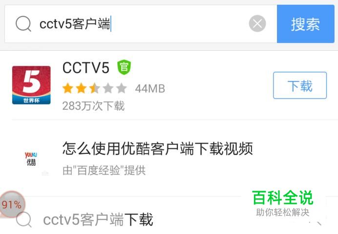 打开手机浏览器,搜索“CCTV5客户端”,在显示的链接里点击“下载”。