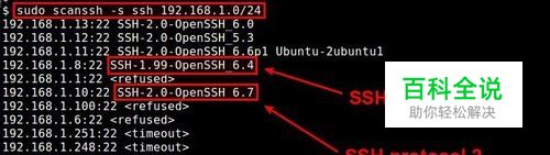方法三 另一个检查版本的方法是运行SSH扫描工具,叫做scanssh。这个命令行工具在你想要检查一组IP地址或者整个本地网络来升级SSH1兼容的SSH服务器时很有用。 下面是基本的SSH版本扫描语法。 sudo scanssh -s ssh -n [ports] [IP addresses or CIDR prefix] "-n"选项可以指定扫描的SSH端口。你可以用都好分隔来扫描多个端口,不带这个选项,scanssh会默认扫描22端口。 使用下面的命令来发现192.168.1.0/24本地网络中的SSH服务器,并检查SSH协议v版本: sudo scan -s ssh 192.168.1.0/24