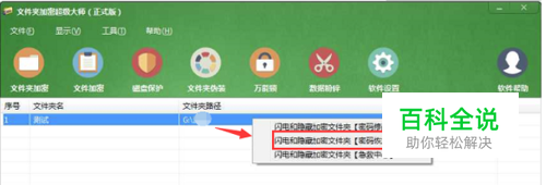 密码恢复功能: 请您打开文件夹加密超级大师软件,在忘记密码的加密文件夹上单击鼠标右键,然后选择“闪电和隐藏加密文件夹密码恢复”。