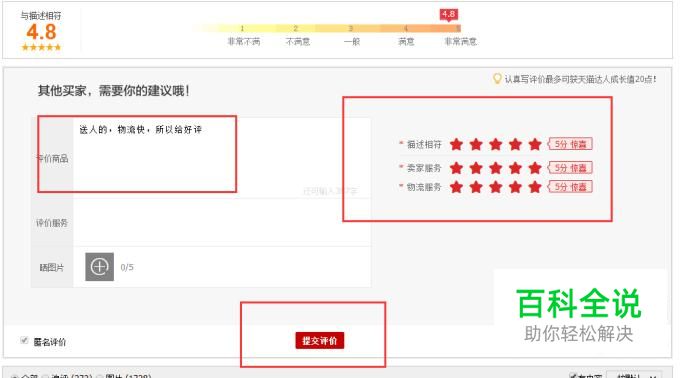评价内容 然后输入【评价内容】,将五颗星点满之后就是给好评了如下图所示: