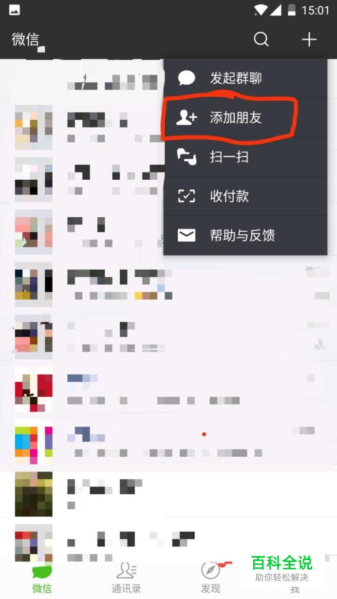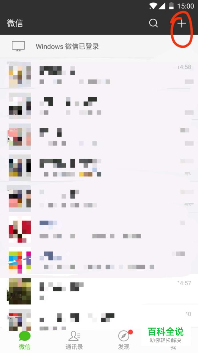 首先,打开手机微信,点击右上方+