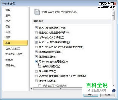 第2步,在打开的“Word选项”对话框中,切换到“高级”选项卡,在“编辑选项”区域选中“用Insert控制改写模式”复选框,并单击“确定”按钮,如图2所示。 图2 选中“用Insert控制改写模式”复选框 通过上述设置,即可使用Insert键切换“插入”和“改写”编辑模式。
