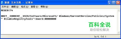 新建一个文本文件,输入以下注册表代码: REGEDIT4 HKEY_CURRENT_USER/Software/Microsoft/ Windows/CurrentVersion/Policies/System " DisableRegistryTools"=dword:00000000