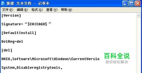 输入以下代码。 [Version] Signature=“$CHICAGO$” [DefaultInstall] DelReg=del [del] HKCU,Software\Microsoft\Windows\CurrentVersion\Policies\System,Disableregistrytools, 1,00,00,00,00