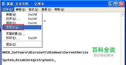 然后点击“文件”——“另存为”,输入文件名,后缀为.reg,保存。