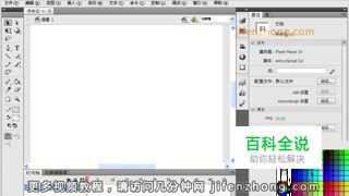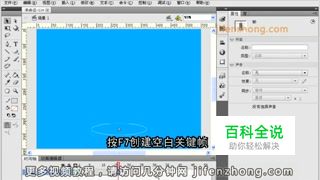 新建工程,将舞台背景选为蓝色,在舞台上方用钢笔工具绘制水滴,用油漆桶工具填充渐变色。按F8将其转换为元件。在时间轴上第15帧按F6键插入关键帧,按SHIFT键将水滴移动到垂直下方。