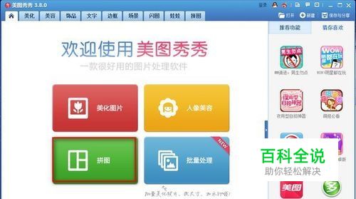 运行美图秀秀,点击拼图按钮。然后在弹出的对话框里选择合并图片功能。