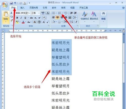 1.加编号 方法:选择多个段落,从“开始”菜单——段落中的编号按钮,单击后面的倒三角,选择已有的编号单击
